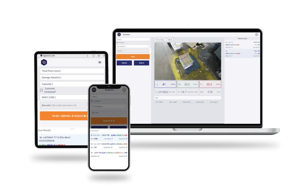 Die benutzerfreundliche Spectre Link-App von Cargo Spectre kann auf jedem Gerät in Ihrem Lager installiert werden. Durch die Steuerung der Wiege- und Vermessungshardware erfasst Spectre Link zertifizierte Frachtabmessungen effizienter und genauer als je zuvor. Das Beste daran ist, dass Sie von Computern, Tablets und Smartphones weltweit sicher auf die Vermessungsgeräte Ihres Unternehmens zugreifen und diese steuern können.
